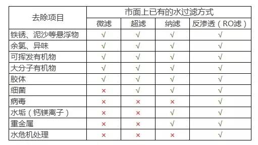 不同的濾芯=不同的過濾孔徑=不同的過濾精度,微濾最低,反滲透(RO膜)最高。